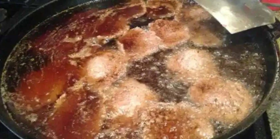 El método de preparación comienza con bolas de carne que son aplastadas antes de ser cocinadas en grandes sartenes de hierro fundido llenas del aceite original.